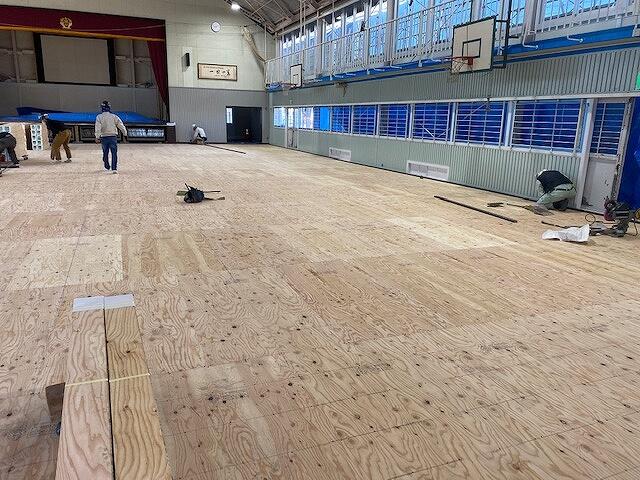11月8日現在の体育館工事の様子です。フロアにはすでに土台となる板が、一面に張られていました。また、床材がどんどんと搬入されていました。鉄製だった窓枠はアルミ枠窓に変更され、一部サッシもはめ込まれていました。工事は順調に進んでいました。