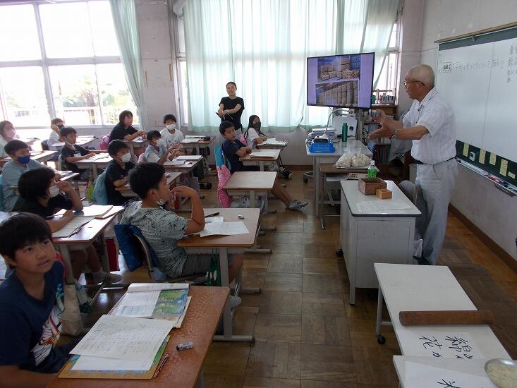 7月12日、5年生は地域の農家の方を講師にお招きし、米作りに関する出前授業を受けました。社会科で庄内平野の米作りを学習し終えたところで、大平地区の米作りはどうなっているのかという内容で、お話を伺いました。当日は講師の方から、伝統的な米作りの道具や実際に作った玄米、もち米、白米や苗箱など、様々なものを実際に見せていただきました。多目的教室に展示してあります(1学期中)ので、ご興味がある方は、ぜひご覧ください。この日のためにどんな話をしたらいいか、どうすれば分かってもらえるかなど、いろいろ考えながら講師の大役を務めていただきました。お忙しい中、大変お世話になりました。ふるさと大平の米作りが自慢できることだと分かり、貴重なまとめの学習となりました。