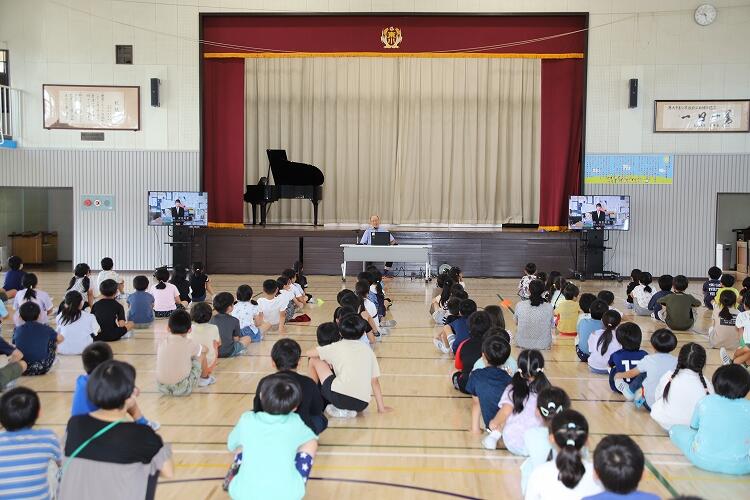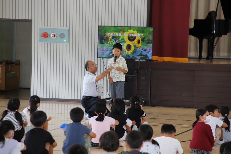 7月20日、第1学期終業式を実施しました。はじめに表彰がありました。陸上や空手の大会で活躍した子どもたちに賞状を授与しました。おめでとう。その後は終業式を行いました。国歌と市民の歌を斉唱した後は、各クラスの代表児童が、1学期の振り返りを発表しました。「算数の計算をがんばりました。」「あいさつをがんばりました。」など、がんばったことをしっかりと発表していました。そして校長先生のお話では、1学期の学習や行事の様子をたくさんの写真で振り返りました。モニターに映し出された写真を見ながら、子どもたちは楽しそうな歓声を上げていました。いよいよ夏休みです。自分で決めたことに進んで取り組み、充実した夏休みを過ごしたいですね。また、病気や事故などにも十分気を付けましょう。フォトアルバムに写真があります。ご覧ください。