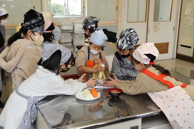 2月2日、3年生はとちぎ食育応援団の講師をお迎えし、しもつかれ作りに挑戦しました。しもつかれの由来や材料などの説明を聞いた後は、早速しもつかれ作りに取りかかりました。大根やにんじんを「おにおろし」を使って、おろしていきました。はじめのうちは難しかったようですが、次第におろし方も上手になっていきました。材料の準備が終わると、講師の先生方に煮ていただいたり、味付けをしていただいたりしました。いよいよ試食の時間になりました。子どもたちからは「おいしい!」の声が上がりました。何度もおかわりをする子もいました。子どもたちにとっては、伝統にふれるとてもよい経験になりました。講師をしていただいたとちぎ食育応援団のみなさん、ありがとうございました。