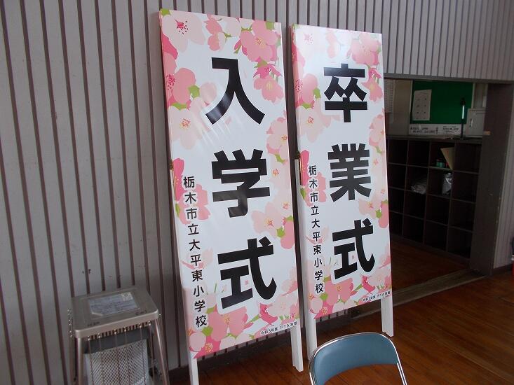 3月8日、体育館ステージ上に掲示する「卒業おめでとう」の看板が設置されました。裏面は「にゅうがくおめでとう」になっています。また、同時に玄関等に設置する縦型の看板も納入されました。今年度のPTAの予算をいただき、購入させていただいたものです。90周年で購入させていただいた一文字幕と合わせて、式場がさらに華やかになりました。ご報告させていただきます。PTAの皆様、ありがとうございました。今後も大切に使用させていただきます。