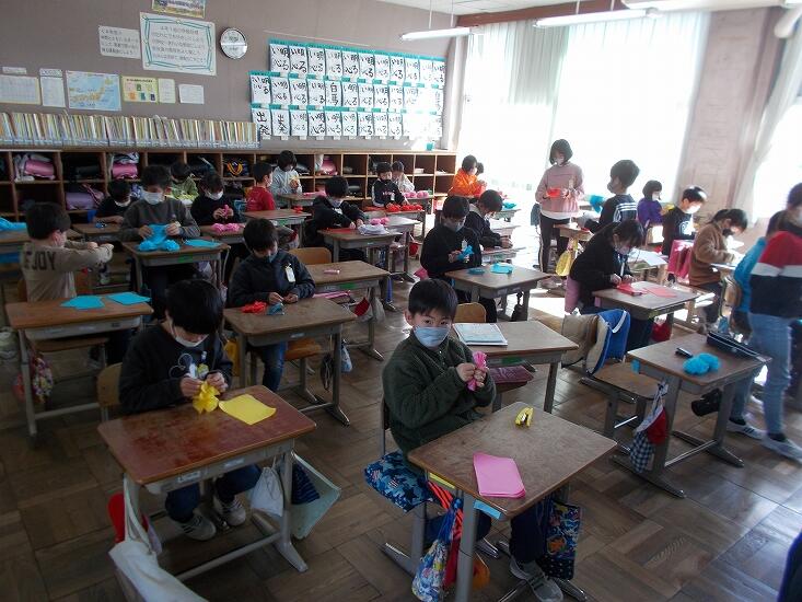 また、2月16日のロング昼休みは、各学年が「6年生を送る会」に向けての練習に取り組んでいました。1~3年生は、それぞれに6年生に見てもらう出し物の練習をしていました。4年生は教室で花飾りを一生懸命作っていました。5年生はなかよし班で送るメッセージを、寄せ書き風にまとめていました。心を込めた「6年生を送る会」になりそうです。