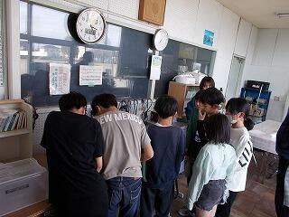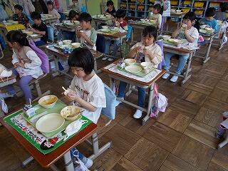 令和6年度最初の給食。「おいしいですか~?」と尋ねると「おいしいです!」と元気な声で答えてくれました。