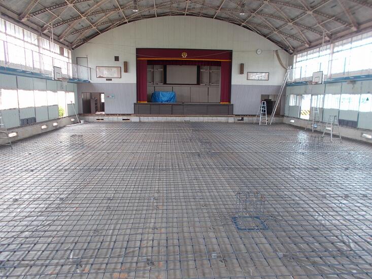 7月21日より始まった体育館工事。着々と工事が進んでいます。今日現在、床は全面取り外され、土間部分の基礎コンクリート工事が終わっていました。工事が進んだら、また様子をお伝えしたいと思います。