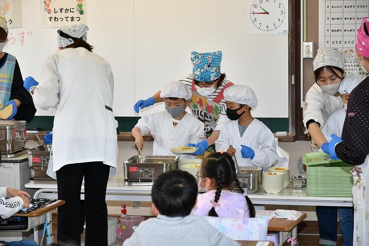 4月17日、1年生の給食開始に合わせ、給食支援ボランティアも始まりました。給食当番に初めてチャレンジする1年生の支援ボランティアです。この日は4名のみなさんに協力していただきました。1年生は36人いますので、配膳も大変です。ボランティアさんのおかげで、戸惑うことなく、準備や配膳ができました。今週いっぱいボランティアは続きます。1年生も次第に慣れていくことでしょう。ボランティアにご協力いただいたみなさん、ありがとうございました。そしてこれからもよろしくお願いします。フォトアルバムに写真があります。ご覧ください。