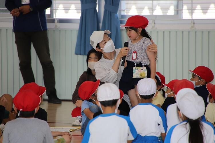 また、6月22日は音楽鑑賞会を実施しました。この日お招きしたのは、栃木県警察音楽隊とカラーガード隊のみなさんでした。演奏が始まると、子どもたちはその音の迫力に大盛り上がりでした。特に知っているアニメの曲や童謡が演奏されると、拍手をしながら楽しそうに聞き入っていました。また、カラーガード隊のみなさんと音楽に合わせて一緒に踊る場面もありました。先生方も音楽に合わせて、子どもたちと一緒に踊りました。演奏の合間に、『いかのおすし』をコント劇をとおして教えてもらいました。楽しいキャラクターにふんした警察官のお二人が、コントを交えて『いかのおすし』を説明しました。みんな大笑いしました。とても楽しい時間を過ごすことができました。音楽隊、カラーガード隊のみなさん、ありがとうございました。