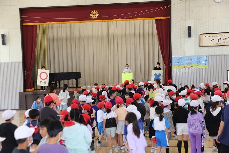 6月14日、県民の日集会を実施しました。県民の歌を歌った後は、栃木県に関する3択クイズに挑戦しました。正解が発表されるごとに、子どもたちはそれぞれ歓声を上げていました。集会の運営をしたのは、運営委員会の子どもたちです。栃木県を身近に感じることができた集会になりました。