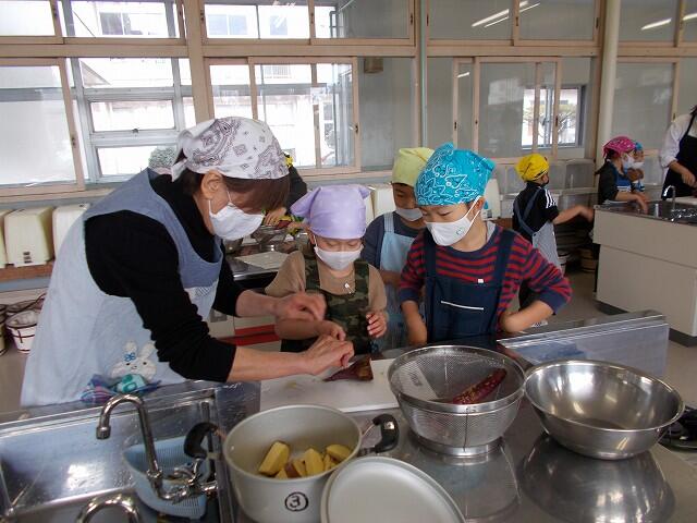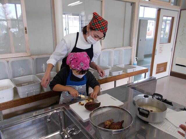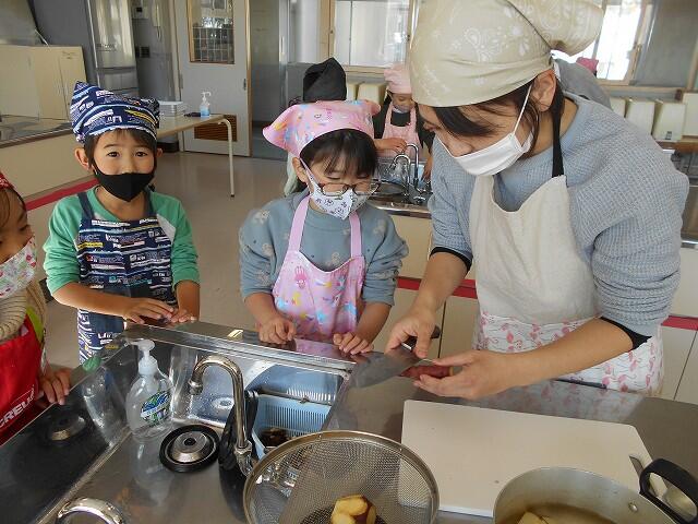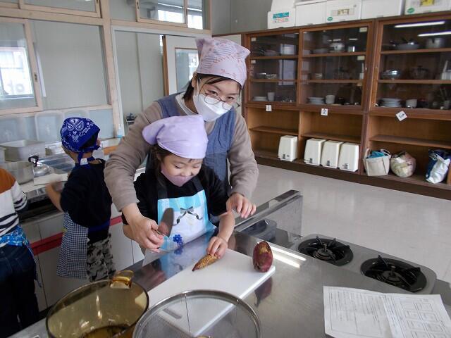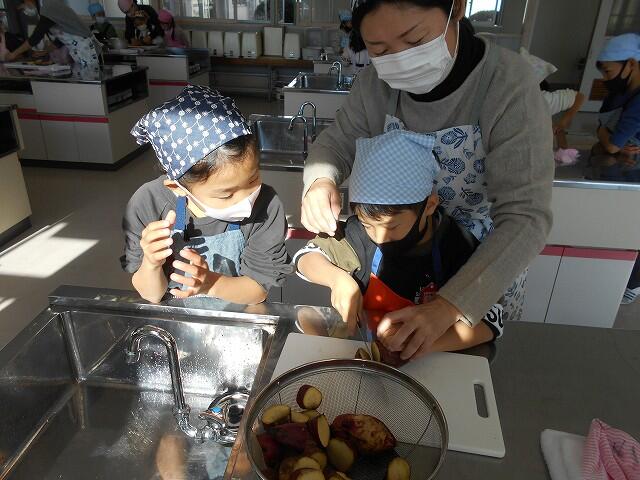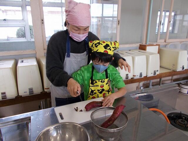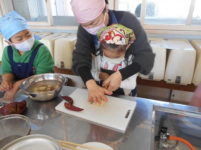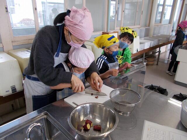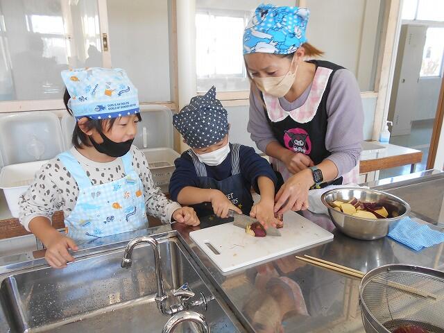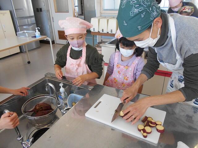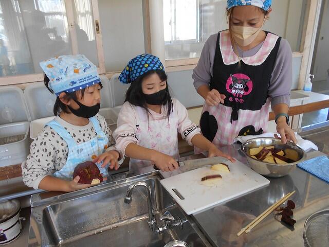 本日、サツマイモの調理をしました。初めて包丁を持つ子もいましたが、手伝いで来てくださった保護者の方が丁寧に分かりやすく教えてくださいました。