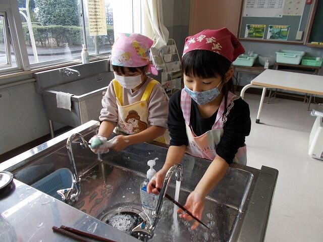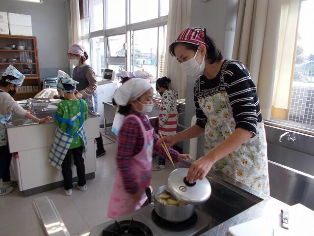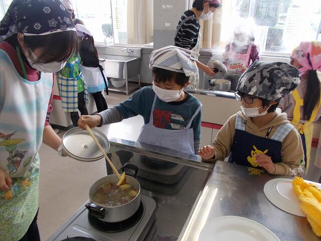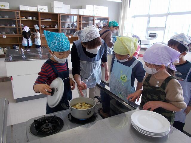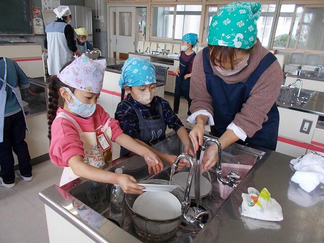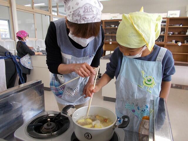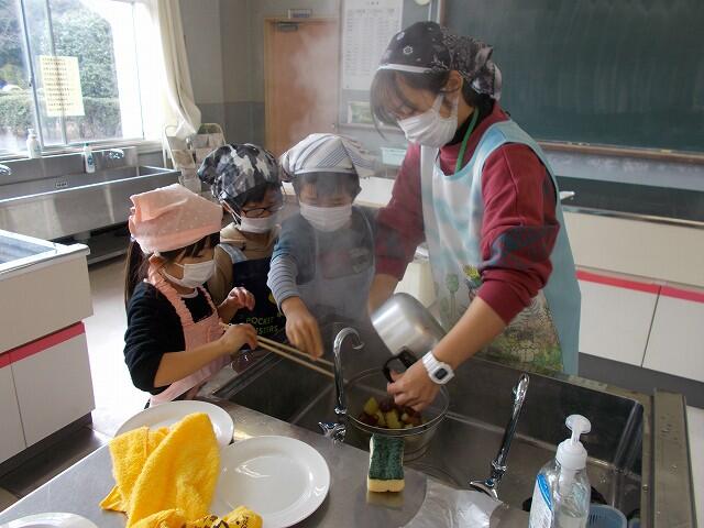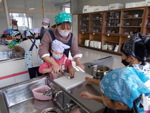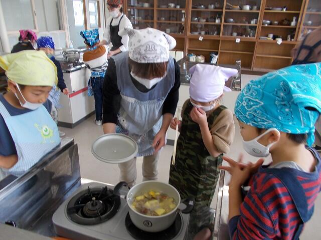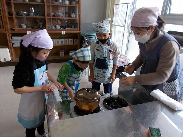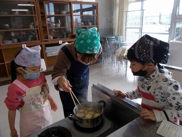 本日、サツマイモの調理をしました。初めて包丁を持つ子もいましたが、手伝いで来てくださった保護者の方が丁寧に分かりやすく教えてくださいました。