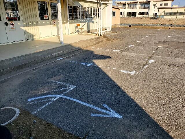 ★入学説明会や卒業式等,体育館で受付をする場合にお並びいただく目印を,体育館東側駐車場につけました。いわゆる3密を避けるように,ご協力お願いいたします。