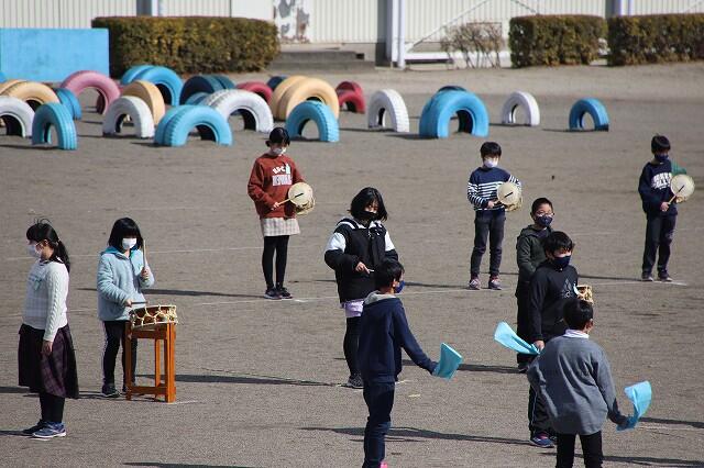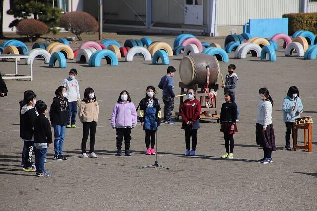 40年以上も続く『東小音頭』のおはやし引継ぎ式ですが,昨年度は,新型コロナウイルス感染拡大防止のため例年に比べて縮小し,5・6年生のみでの実施となりました。