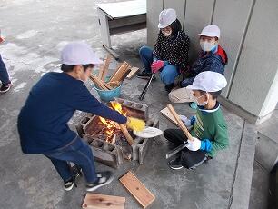 自然の家に到着すると、マイスプーン作りをしました。持ち手になる小枝を選んで、スプーン先を付ける穴を開けました。穴開けは、なかなか大変な作業でした。それぞれ個性的な作品が仕上がりました。夕食後はナイトハイキングへ出発。応援に来てくれた先生も加わり、夜景スポットへ。夜景を見た子どもたちは「きれい!」と声を出していました。2日目。杉板焼きに挑戦しました。「煙が目にしみるー!」「まだまだ焼けないなー。」など、楽しそうにたき火で板を焼きました。焼いた板を磨く子どもたちの顔は、炭で所々黒くなっていました。何とも愛らしい顔でした。また徒歩で長い距離を歩いたことは、達成感にもつながりました。友達との絆(きずな)も深まった2日間でした。