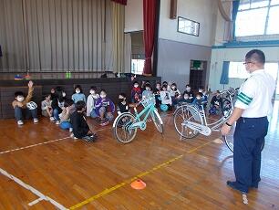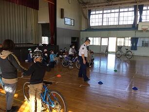 10月26日、3・4年生はふれあい集会を実施しました。この日は、栃木警察署の方を講師にお招きし、親子で学ぶ「交通安全教室」を企画しました。校庭のコンディションが悪かったため、体育館での実施となりました。はじめに自転車の安全な乗り方に関するお話を聞き、その後子どもたちは、役員さんが準備してくれた自転車に乗り、安全な自転車運転に挑戦しました。小学生は歩道を自転車で乗ることができることやヘルメットの着用義務があることなど、法律で決まっていることも改めて知ることができました。最後になりましたが、PTA役員の方々には諸準備等お世話になりました。また、お忙しいところ保護者の皆さんに参加していただき、ありがとうございました。子どもたちの安全のために、これからもご理解とご協力お願いします。