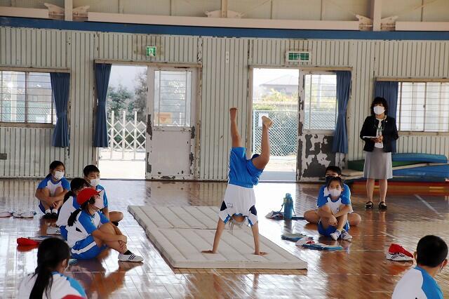 保健体育の教員免許を取得する予定ということで,体育館でマット運動の授業を行いました。自分で手本を示すなど,緊張でいっぱいながらも,若い力を十分に発揮して堂々と授業を進めていました。子供たちが発表した演技に対して温かなコメントで励ましていたので,子供たちも更に張り切って練習に取り組んでいたようです。