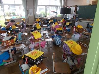 6月23日、震度5強以上の地震発生を想定した、避難訓練からの引渡し訓練を実施しました。まずはじめに、地震の避難訓練を実施しました。授業中に発生したということで、まずは身を守る姿勢を教室でとりました。頭巾を頭にかぶり、机の下のもぐり、足をしっかりと押さえて揺れがおさまるのを待ちました。その後は「お・か・し・も」の合い言葉を意識して、校庭に向かいました。校長からは子どもたちに「訓練には真剣に取り組むこと、地震はいつ起こるか分からない、油断してはいけない」などの話がありました。その後、担任をとおして保護者の皆様への引渡しとなりました。最後になりましたが、保護者の皆様にはお忙しい中、引き渡し訓練に参加していただきありがとうございました。今後もご協力、よろしくお願いします。
