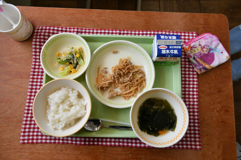 4月11日、令和5年度第1回目の給食です。今年度から毎週火曜日がパンとご飯がかわるがわる提供されることになりました。メニューはご飯、牛乳、ナムル、ビビンバの具、豆腐とえのきのスープでした。おいしくいただきました。