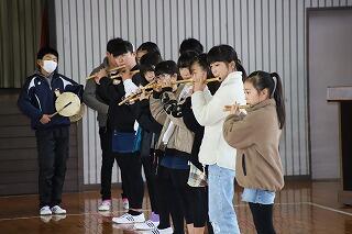 伝統ある『東小ふれあい音頭』を奏でる,おはやしの引継ぎ式が行われました。主に,運動会の特別種目として全校で踊る際に,生演奏・生歌で披露されます。