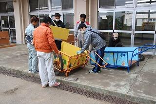◇おやじの会の緻密な計画のもと,事前に,木工業を営むおやじの会メンバーに木枠を新調していただき,さらには,地域の鉄工所の方にさびて朽ち果てていた鉄枠を補修していただき,下地を施された車体と木枠が運び込まれました。