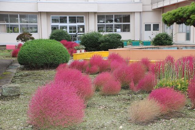 11月8日(金)には立冬を迎えますが,今,本校の中庭のコキアが色付き,葉に矢羽根模様のあるヤバネススキが満開となっています。