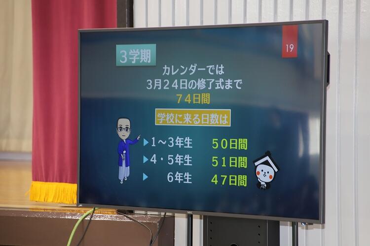 1月9日、第3学期始業式を実施しました。国歌と市歌を斉唱した後は、各クラス代表児童による意見発表がありました。「算数をがんばりたい。」「縄跳びの記録を更新したい。」など、それぞれ3学期のめあてを発表しました。その後は学校長講話でした。話の中で、高学年に向けた算数(割合)の問題が出されました。「小学校の勉強は生きていくために必要です。」との話がありました。小学校で得た知識は大人になってもよく覚えて(使って)いるものです。3学期もめあてをもってがんばりたいですね。フォトアルバムに写真があります。ご覧ください。