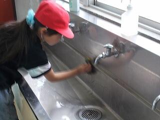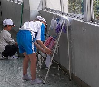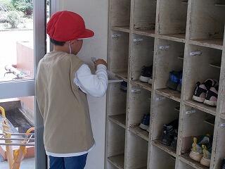 昇降口も一つ一つの下駄箱をきれいにする子、