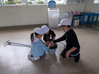 高学年の児童が1年生に雑巾のしぼり方をやさしく教えています。