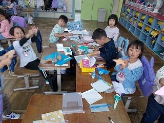 雨で外で遊べないときには教室で折り紙やお絵描きをして過ごしています。