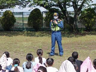 藤棚前に集合。校長先生と消防署の方の話を聞きました。