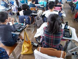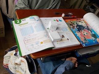 児童用の机の上に習字道具をセットするのは難しい作業ですが、3年生の子供たちは頑張っていました。