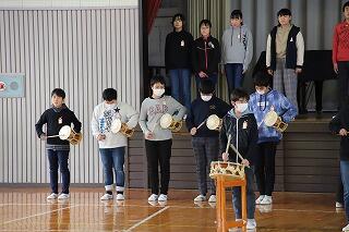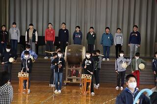 伝統ある『東小ふれあい音頭』を奏でる,おはやしの引継ぎ式が行われました。主に,運動会の特別種目として全校で踊る際に,生演奏・生歌で披露されます。