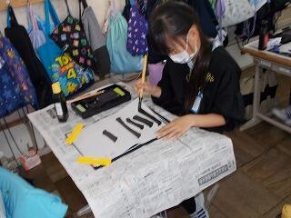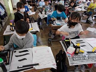 児童用の机の上に習字道具をセットするのは難しい作業ですが、3年生の子供たちは頑張っていました。