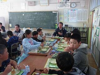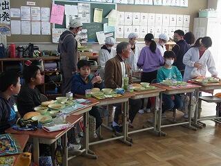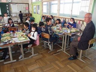 交換会の後は、各教室で児童と一緒に給食を食べていただきました。児童と会話しながら楽しそうに給食を召し上がっていました。