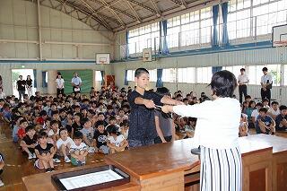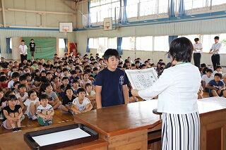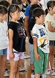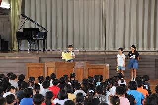 最初に,2年生と4年生代表の意見発表がありました。その後,校長先生から1学期を振り返ってのお話と夏休みの過ごし方についてのお話がありました。