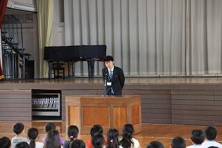 「もっと笑顔になるように,『人の話をよく聞こう。』『自分の考えをよく話そう。』の2つを特に頑張っていきましょう。」という校長先生のお話を,みんな真剣に聞いていました。