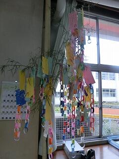 学級活動で、短冊に願いを込めて七夕かざりを作りました。それぞれの願い事をきれいな飾りとともに、教室に飾りました。