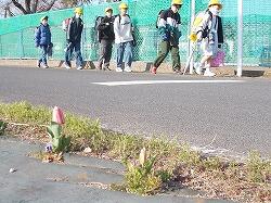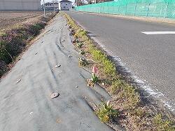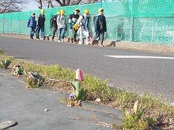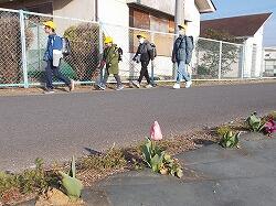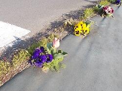 学校東側道路に一列にパンジーが植えられてい