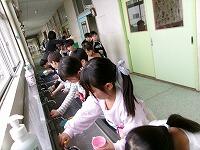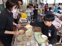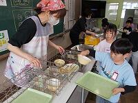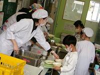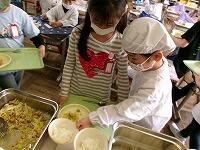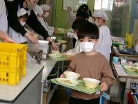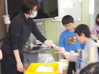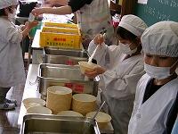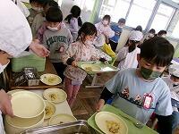身支度を整えた給食当番さんが、初めてのお仕事をがんばりました。