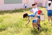 2年生と4年生の校庭での学習風景