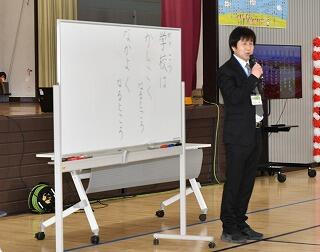 迎える言葉。6年代表児童がお迎えの作文を発表しました。