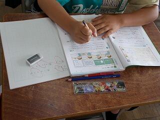 教科書の挿絵を見て、作文を書いていました。段落をつけて書いていました。