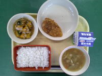 キラキラ【ふるさとメニュー】ごはん ぎゅうにゅう 栃木市産むぎなっとう じゃがいものそぼろに はくさいのみそしる