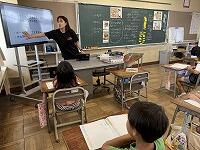 実物のかるたや、先生が作った見本を提示して、子どもたちの興味・関心を高めていました。