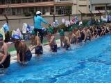 授業は、複数の目で安全を確認するために、3クラス合同で行いました。プールサイドに腰掛けて、頭や顔に水をかけたり、脚をバタバタ上下させたりして少しずつ水に慣れました。