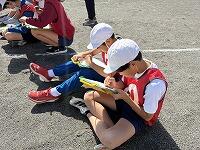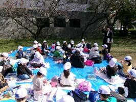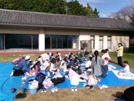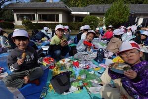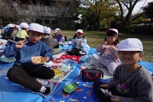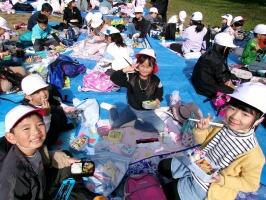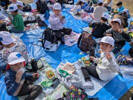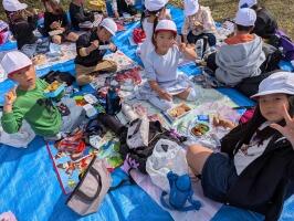 朝が早かったせいか、「お腹がすきました〜」という子がたくさんいます。こうして、みんなでお弁当を食べる行事も…最後になりますね一つ一つが、大切な思い出になります