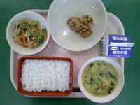 今日は日本の秋田県の郷土料理の「きりたんぽじる」が出ています。きりたんぽは、昔、木こり達が、残ったごはんを棒状に握り、炭火で焼いたのが始まりと言われています。また、このきりたんぽを、お鍋に入れたきりたんぽ鍋も有名です。秋田県は、おいしいお米がとれる県です。生活の中から工夫してできたのが郷土料理です。みなさんも、いろいろな郷土料理を探してみましょう。