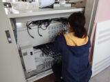週末に家庭でタブレット端末が操作できるか確認するために、1年生が持ち帰りの準備をしました。保管庫から充電アダプターを取りはずので、先生が1台ずつコンセントからはずします。