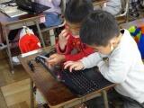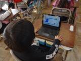 タブレットを受け取ると、操作が得意な子はどんどん自分でログインできました。不安な子は先生や友達に聞きながら学習用アプリ「eライブラリ」を始めました。
