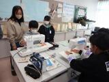 2年生は、算数で「数の迷路」に挑戦しました。タブレット端末で使ってわかりやすく説明したので、迷路のルールを理解して、答えを見通してどんどん問題に取り組みました。答え合わせも子どもの解答を画面で写して確認しました。これまでに身に付けた暗算する力をしっかり活用していました。
