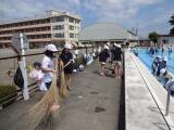 昼休みに、運動委員会の委員長、副委員長と校長先生で、プール開きを行いました。4人でプールの四隅に清めの塩をまきました。委員長、副委員長にインタビューすると、「みんなが安全で楽しく活動できるように心を込めました。」と話してくれました。