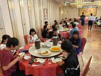 夕飯を食べに横浜中華街にやって来ました。円卓で大皿に盛り付けられた料理を、仲間と上手に取り分けました。
